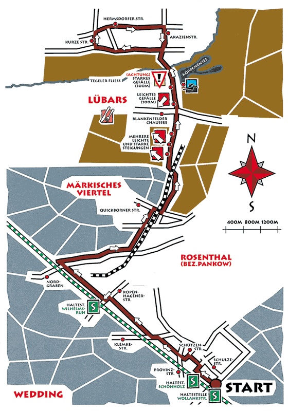 über den Bahnübergang bei km 7,5 und dann geht es über mehrere Steigungen kräftig bergauf. Bei km 8,5 erreichen Sie eine Querstraße (Blankenfelder Chaussee), über die ein Abstecher Richtung Lübars (Gaststätte) möglich ist. Weil es dazu nach links über eine Landstraße ohne Fußweg geht, sollten Sie abschnallen und auf Straßenschuhe umsteigen. Die Hauptstrecke führt geradeaus weiter, zunächst über ein leichtes, dann über ein 300 m langes steiles Gefälle (Vorsicht!). Sie skaten an einer Badestelle vorbei, über eine 50 m lange leichte Steigung und halten sich an der folgenden Weggabelung links.