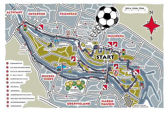 einer T-Kreuzung skaten. Dort nach rechts auf den Sommerdeich abbiegen. Am nächsten Abzweig, noch vor dem Stadion, rollen Sie nach links auf den Fußweg der rechten Seite. An der T-Kreuzung vor dem Deich skaten Sie nach rechts (Auf dem Peterswerder). Aufgepaßt: Sie müssen sich kurz die Straße mit den Pkw's teilen.