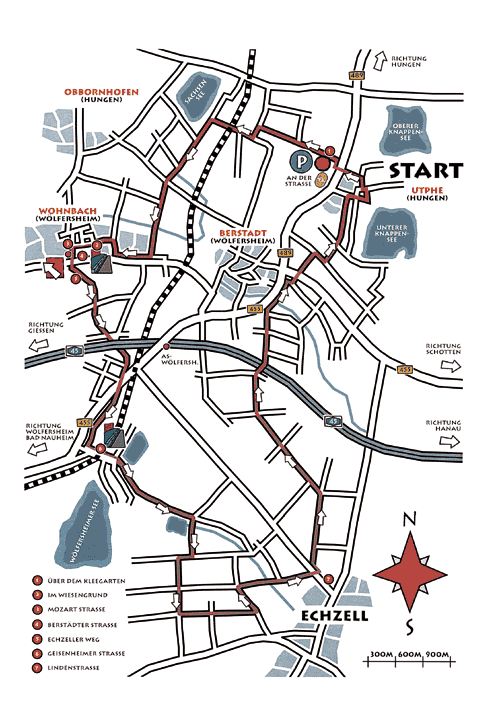 und kurz darauf durch eine Linkskurve. Der Landwirtschaftsweg bringt Sie in ein Wohngebiet. Wechseln Sie auf den Bürgersteig links an der Straße "Im Wiesengrund". 200 m weiter biegen Sie nach links ab (Mozart Straße). Hinter der Schillerstraße, die Ihren Weg quert, geht es mit einer Steigung zur Berstädter Straße, der Sie nach rechts folgen. 100 m nur, dann haben Sie auf der anderen Straßenseite Anschluss an den Echzeller Weg, der Ihnen auf den nächsten 2 km feinste Betonplatten bietet.